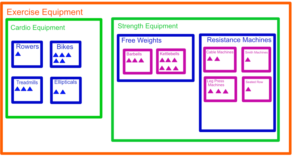 In the diagram I threw together below, you can see how a gym can build out their categories to track the equipment they manage. The individual assets are drawn as triangles and fall into each category they belong to.